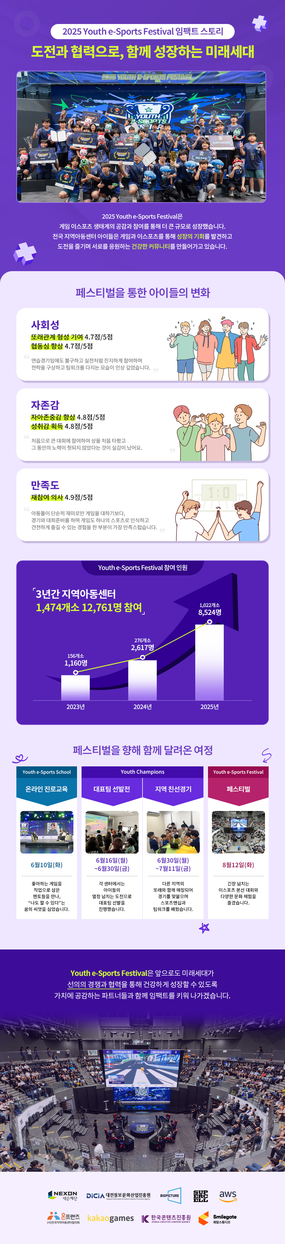 스마일게이트 희망스튜디오는 유스 이스포츠 페스티벌을 통해 아이들이 스스로 협력하고 창의적으로 도전하며, 사회 속에서 자신의 가능성을 발견하는 성장의 여정으로 발전시켜 왔습니다. 올해도 청소년들은 경기장에서 자신에 대한 확신과 친구들과 하나됨을 느끼고, 다양한 체험을 통해 새로운 잠재력을 발견했으며, 다양한 기업과 기관들은 각자의 강점을 기반한 협력을 통해 사회적 가치를 더욱 확장해 나갔습니다.