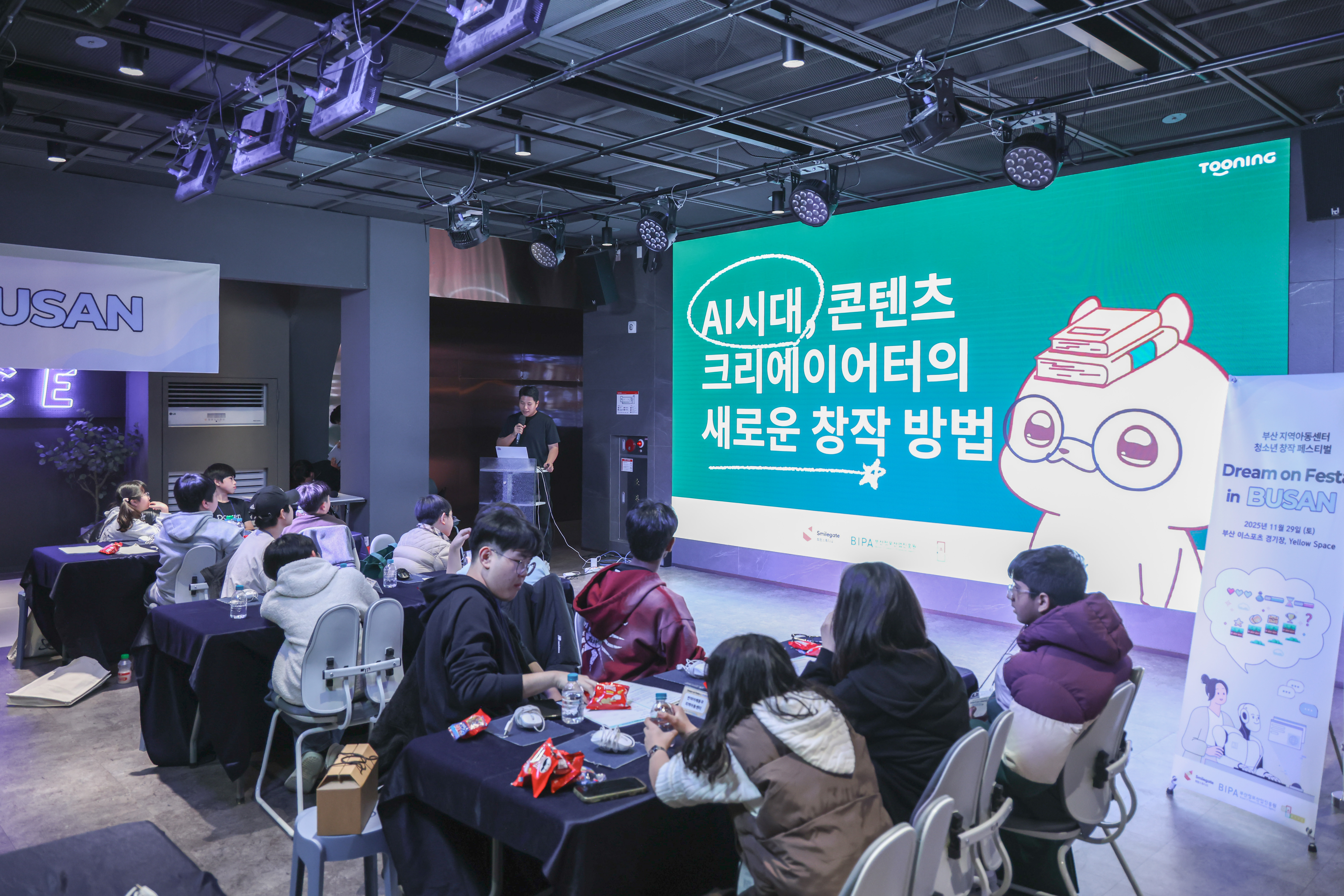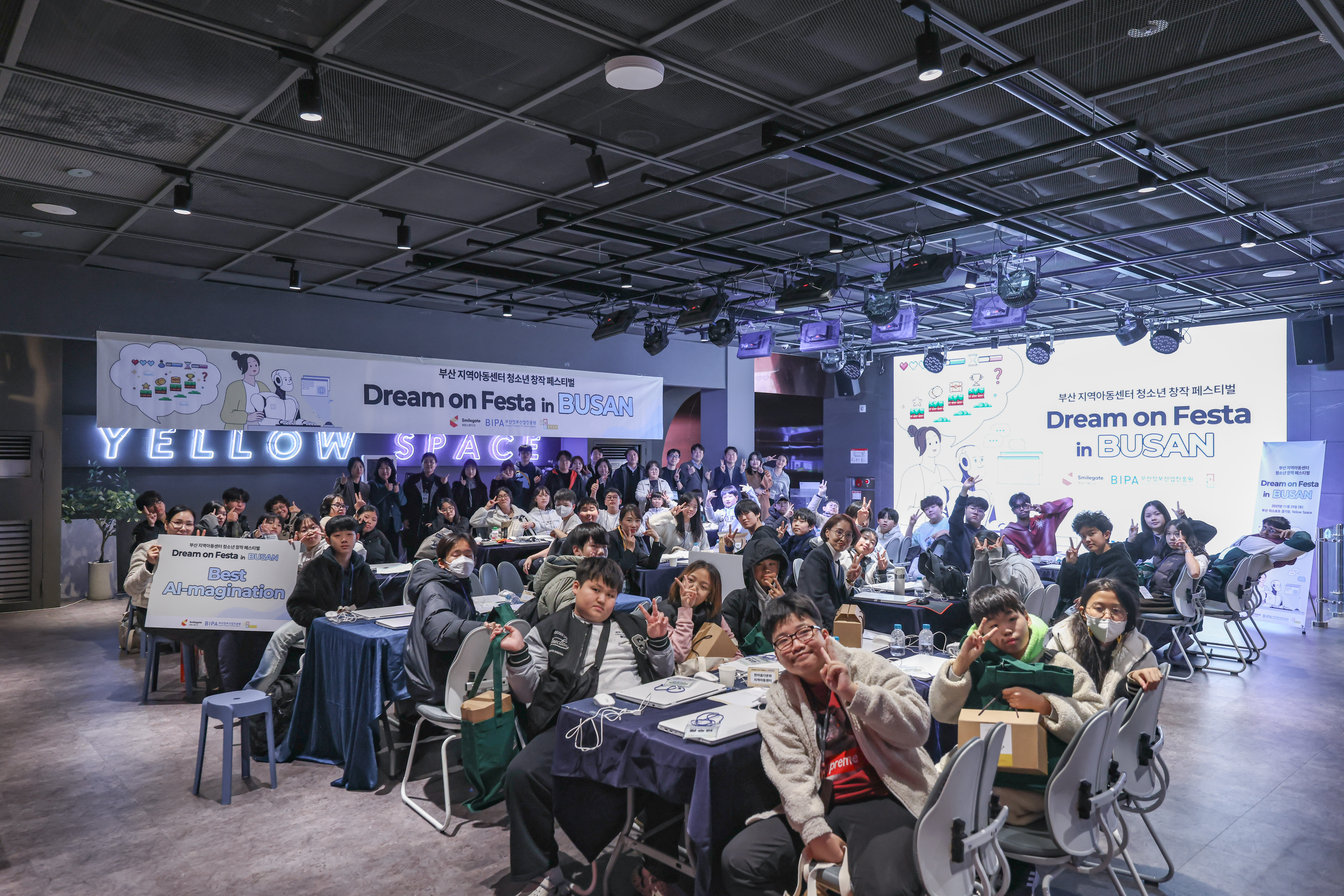 지난 11월 29일 토요일 오후, 부산 이스포츠경기장 옐로 스페이스가 청소년들의 열기로 가득 찼다. 부산 지역아동센터 8곳에서 모인 60여 명의 아동·청소년과 교사들이 특별한 창작 여정을 시작하기 위해 모인 것. 스마일게이트 희망스튜디오가 부산정보산업진흥원과 손잡고 마련한 '드림 온 페스타 인 부산', 그 현장 속으로 들어가 보자.