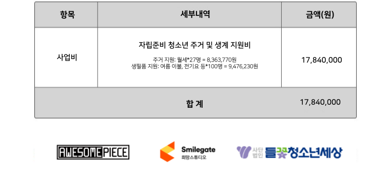 어썸피스 임직원 분들이 사내 자선 경매를 통해 17,840,000원 을 모아주셨고,