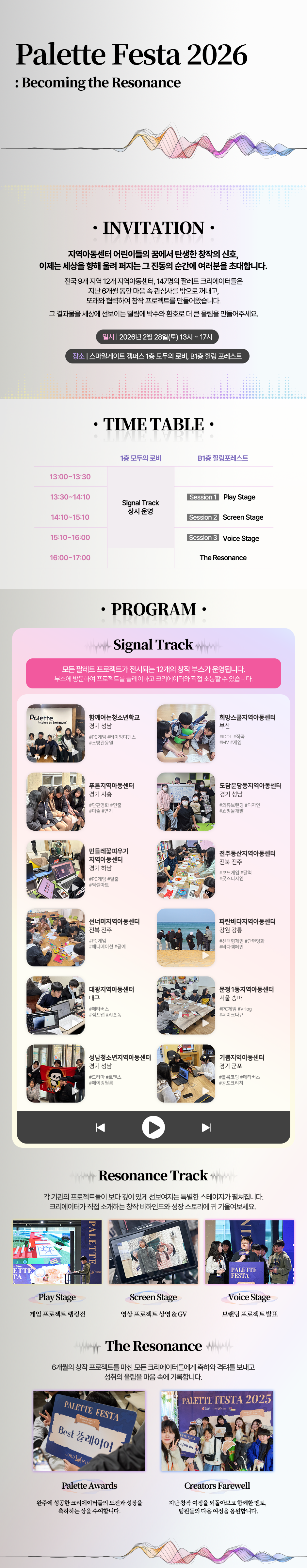 행사는 게임, 영상, 굿즈 등 51개의 창작물을 체험하고 의견을 주고받는 ‘시그널 트랙’과 창작물의 제작 과정을 소개하는 ‘레조넌스 트랙’으로 구성됐다. 참가자들의 열정과 땀방울이 마침내 하나의 뜨거운 '울림(Resonance)'을 만들어낸 현장을 소개한다.